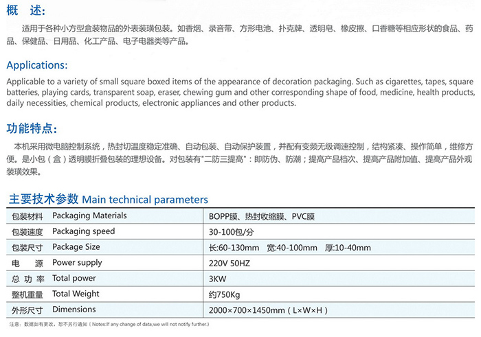 GBZ-130B透明膜三維自動(dòng)包裝機(jī)適用于各種小方型盒裝物品的外表裝璜包裝.如香煙、錄音帶、方形電池、撲克牌、透明皂、橡皮擦、口香糖等相應(yīng)形狀的食品、藥品、保健品、日用品、化工產(chǎn)品、電子電器類(lèi)等產(chǎn)品。