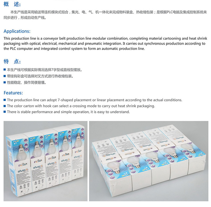 本生產(chǎn)線是采用輸送帶連機模塊式組合,集光、電、氣、機一體化來完成物料裝盒、熱收縮包裝;是根據(jù)PLC電腦及集成控制系統(tǒng)來同步進行,形成自動生產(chǎn)線。